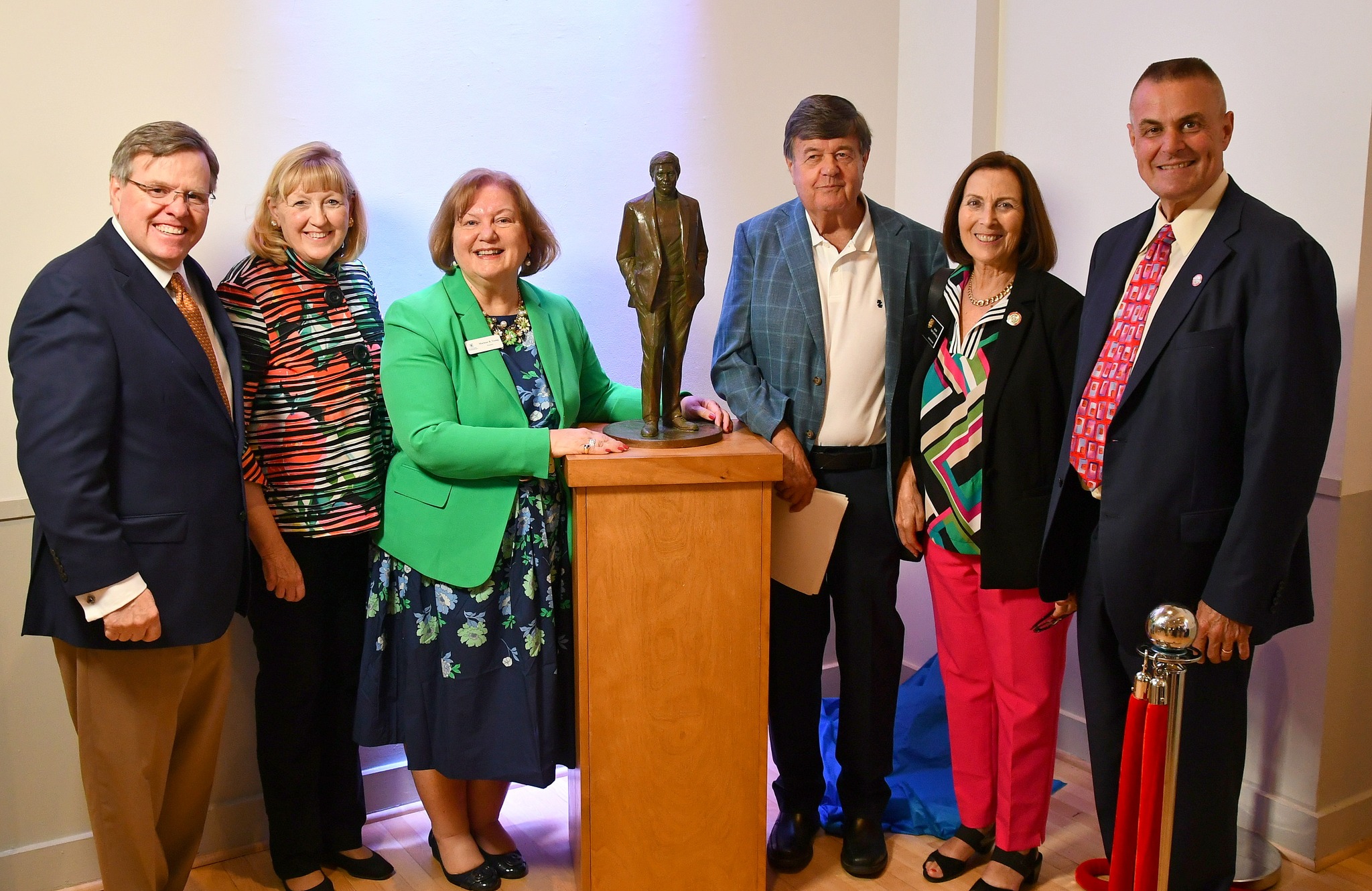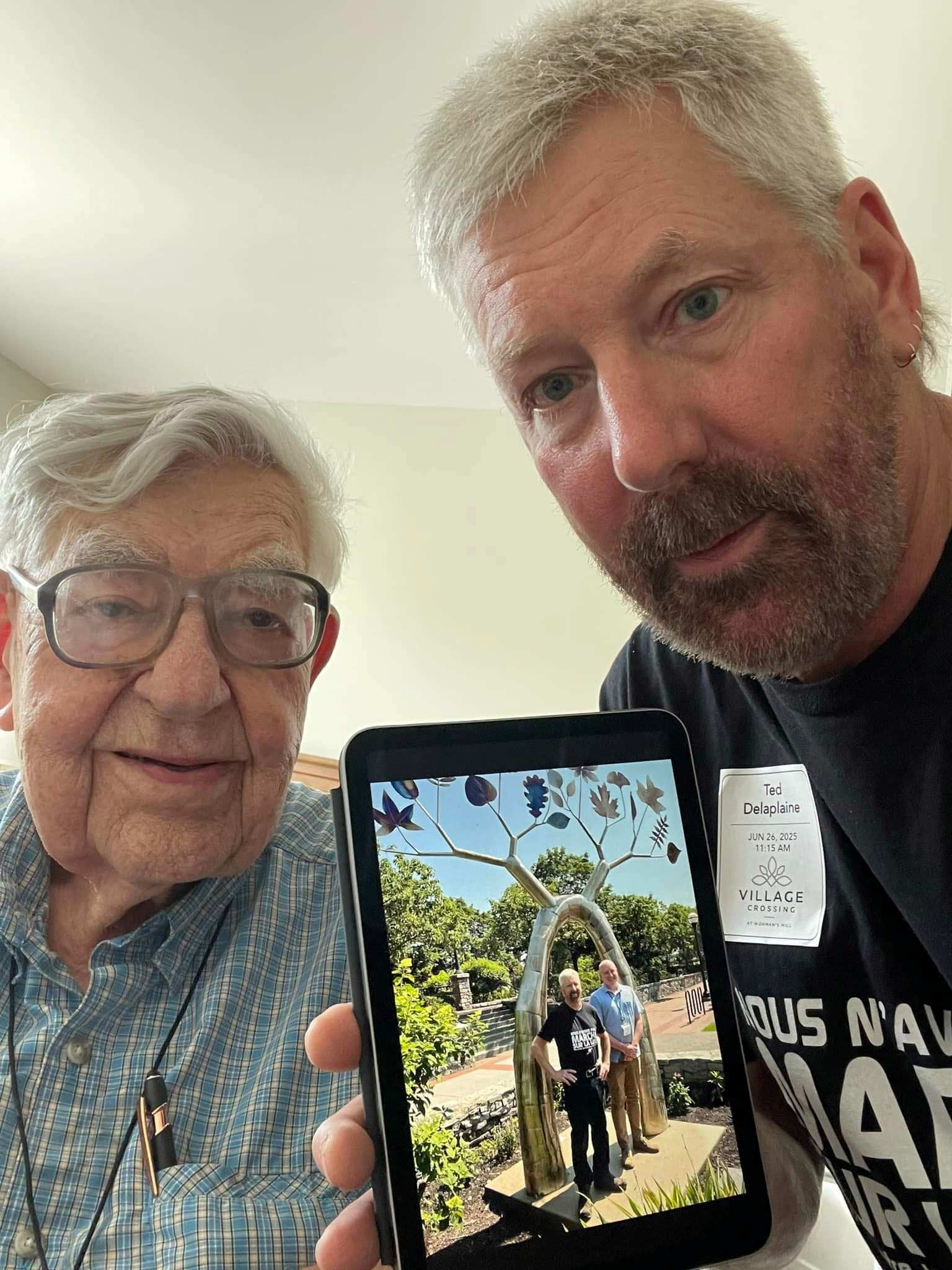 Ted Delaplaine Sharing a Picture with His Father, George, of the Sculpture Dedicated to His Father and Delaplaine Foundation